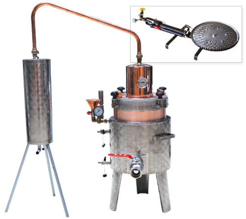 Professioneller doppelwandiger Destillierkessel mit Wasserbad. Verhindert Anbrennen des Gelägers und ermöglicht eine perfekte Temperaturregelung. Ausgestattet mit hitzebeständigen Gummidichtungen für einen perfekten Verschluss. Kühlelement mit Scheiben.