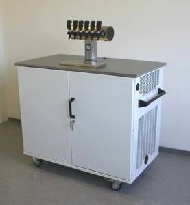 Dispensing Station (2/3 PS), Verwendungsfertig Premix. Ausgestattet mit leistungsstarkem Trockenkühler AT 90 Boston und vollständig montiert mit Rückschlagventilen, Hochdruckschlauch, Hauptdruckminderer und Kontrollmanometer. Inklusive CO2-Flaschenhalter. Die Station bietet Platz für 6 Getränkebehälter.