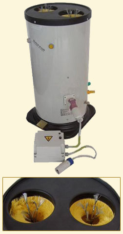 Elektrisches Modell mit drehender Innenbürste und fester Außenbürste. Ideal für Hobby-Weinmacher oder Bierbrauer, welche große Mengen brauen. Wie 021.251.9, aber in doppelter Ausführung: Spült 2 Flaschen gleichzeitig. 24 Volt Stromversorgung, mit dem mitgelieferten Transformator. Kapazität: bis 700 Flaschen pro Stunde. Abmessungen: Höhe 90 cm, Fuß 47 x 47 cm, Gewicht 35 kg