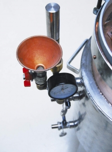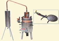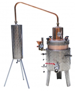 Professioneller doppelwandiger Destillierkessel mit Wasserbad. Verhindert Anbrennen des Gelägers und ermöglicht eine perfekte Temperaturregelung. Ausgestattet mit hitzebeständigen Gummidichtungen für einen perfekten Verschluss. Kühlelement mit Scheiben.